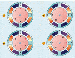 最后,我们再一次切断绕组2中的电流,并给绕组1输送如图2a所示的电流,这样,转子又会回到原来的位置。