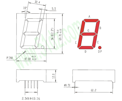 数码管分为共阳型和共阴型,共阴极型就是发光管的负极都连在一起 ,作为一条引线,正极分开。数码有尺寸大小之分,所以价格也各不一样,本数码管8字高度:2.3英寸 / 56.80mm,大小:47.8×69.7mm,欢迎大家选购。