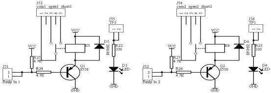 系统板上提供了2路继电器控制模块,分布在系统板的最左上端区域中,输入信号由Realy in 1和Realy in 2端口输入分别控制两路继电器,继电器控制的信号分别由最上端的两个插针输入和输出。分别称为“com1 open1 short1”,“com2 open2 short2”,由于这个两个继电器是单刀单掷控制,当继电器不吸合时,“com1”和“short1”相通,“com2”和“short2”相通;当继电器吸合时,“com1”和“open1”相通,“com2”和“open2”相通。其电路原理图1.1所示: